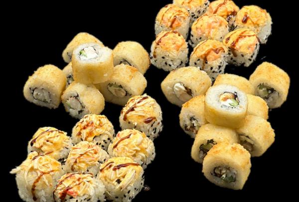 С лососем запеченный (Лосось, огурец, сыр творожный, сырная шапочка, соус Терияки, тобико), Темпура Сяке (Лосось, сыр творожный, икра Лососевая), Гейша (Лосось, сыр творожный, огурец)
